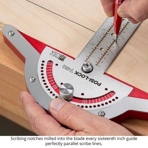 Дори когато не работите с ъгли, това е чертожен инструмент, който ще използвате за почти при всеки проект. Острието е със същите уникални нарези за чертане. На всеки 15 мм по цялото протежение на линията има срез. Просто вкарайте молива в среза и плъзнете главата по ръба на материала, за да получите идеално права успоредна линия.