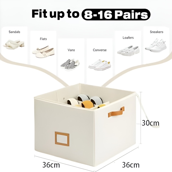 Органайзерът за обувки SHOVERA е проектиран да побира 8-16 чифта обувки, включително сандали, чехли и маратонки, в компактен размер 36x36x30 см. Сгъваемият му дизайн позволява лесно прибиране, когато не се използва, което го прави идеален за домове, общежития и сезонни обувки.