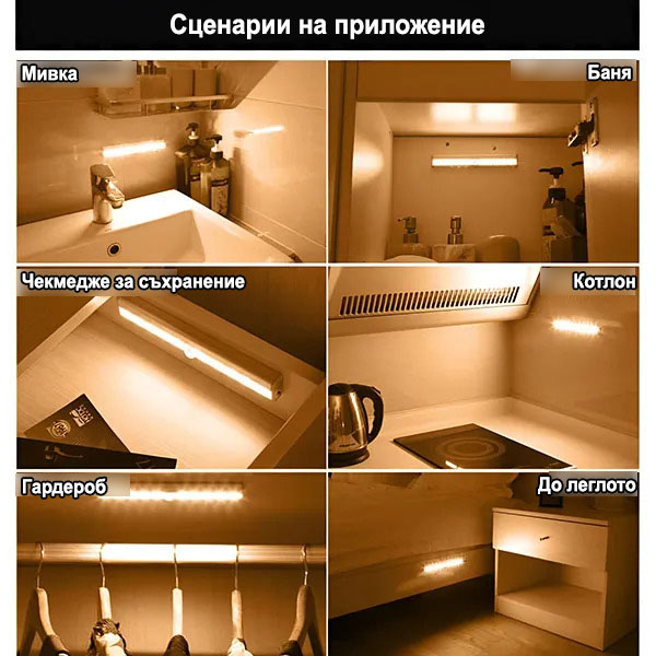 Поставете 4 AAA батерии, след което закрепете с включената магнитна лента или залепваща лента – без инструменти, без пробиване, без повреди по стените. Поставете я в гардероб, под шкаф или до леглото си и работи веднага.