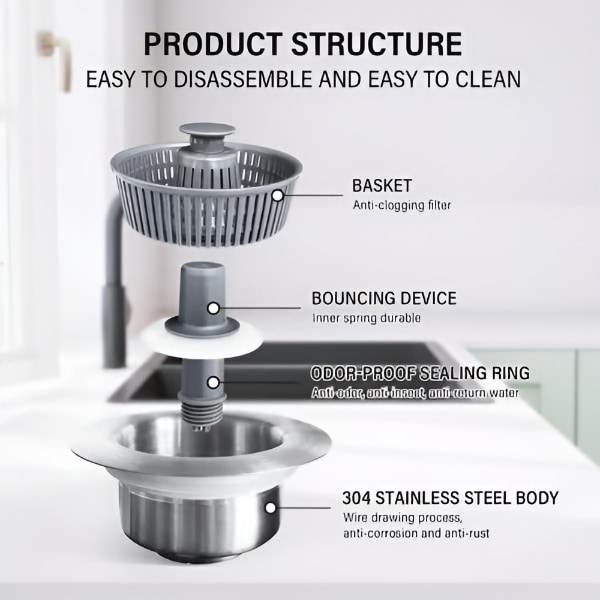 Изработена от висококачествена неръждаема стомана и ABS, тази цедка за оттичане на мивка е създадена да издържи дълго, да издържа на топлина и да не ръждясва, което я прави лесна за използване и поддръжка.